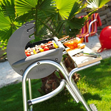 Контейнер очага чугунный, с центральной перегородкой, экономный и практичный, перегородка позволяет раздельное использование отсеков контейнера, легко перемещаемая тележка, рабочая доска с передней стороны, регулирование решетки по высоте, несколько положений для вертела, двигатель и вертел в комплекте поставки.