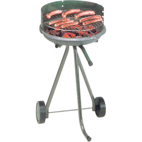 Контейнер очага чугунный, равномерно распределяющий тепло, легко перемещается тележка, рабочая доска с фасада, регулирование решётки по высоте, стальной защитный кожух.