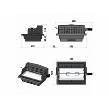 Барбекю с возможностью приготовления паэльи, из конгломерата белого цвета. Плита и топка из огнеупорного кирпича, встроенные решетка и зольник. Размер топки 90х70.