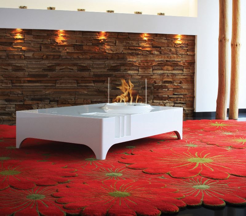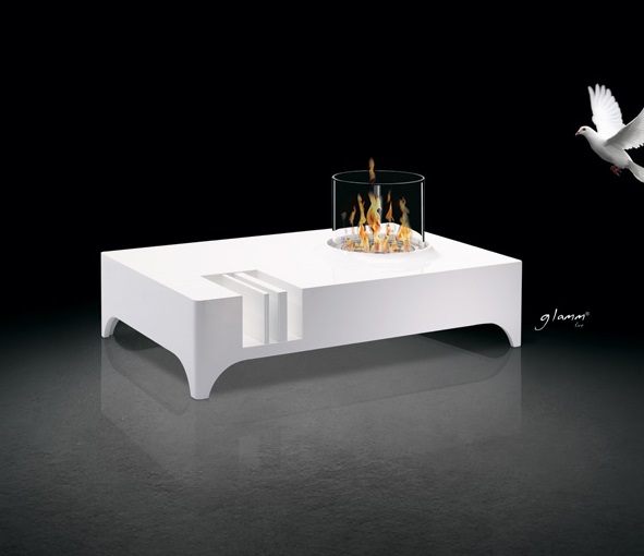 Дизайн напольного биокамина GlammFire Vulcanu вдохновлен внешним видом кратера вулкана. Разместив журналы и газеты в специально предназначенных для этого отделениях в облицовке камина, можно получить необходимые акценты.