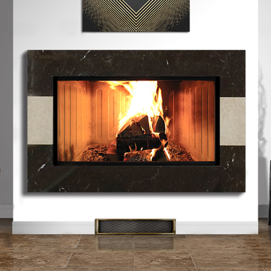 Минималистичный каминный портал в современном стиле. В наибольшей степени он подходит для обрамления больших топок с максимально открытой для обзора пламени фронтальной частью. В таком сочетании этот портал смотрится как изысканное обрамление волшебной живой картины из танцующих огненных лепестков. Особенность этого камина — использование двух сортов натурального камня, подбираемых так, чтобы их сочетание было максимально контрастным.