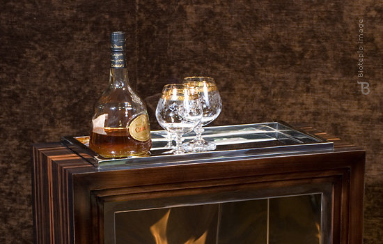 Фронтальная часть биокамина имеет изящный бортик. Верх модели венчает блестящий металлический поднос для фруктов, вин и сигар. Модель на колесиках, поэтому перекатить биокамин в другую часть помещения не составит труда.