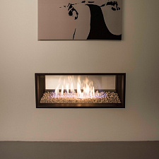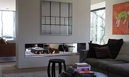 В отличие от напольных, сквозные панорамные биокамины занимают меньше места. Приспособление идеально заполнит нишу или проем в стене. Со стороны это выглядит эффектно и стильно. При этом решается сразу три проблемы: заполнение и оформление отверстия; размещение биокамина в небольшой комнате; установка одного очага на две комнаты.