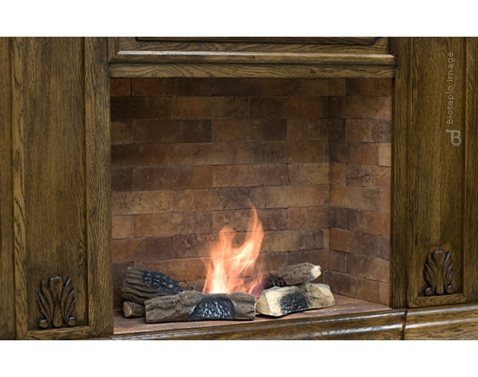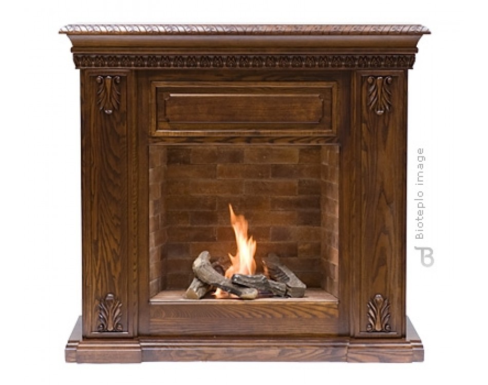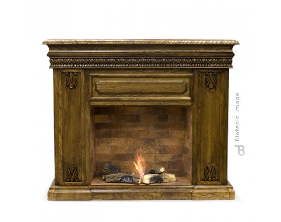 Портал биокамина выполнен в корпусе «Дуб» и отделан изящным резным орнаментом с повторяющимся раппортом.