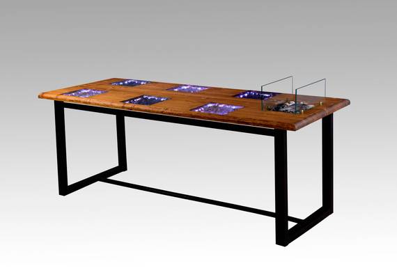 Обеденный стол Fiesta превратит вечеринки и праздники в незабываемое файер-шоу. Кроме биокамина, установленного в торце, сосновую столешницу дополняют сияющие ниши с LED-подсветкой. Каждое из 6 посадочных мест украшает квадрат из закаленного стекла, под которым помещаются декоративные камни и светодиоды. Они эффектно подсвечивают блюда и бокалы.