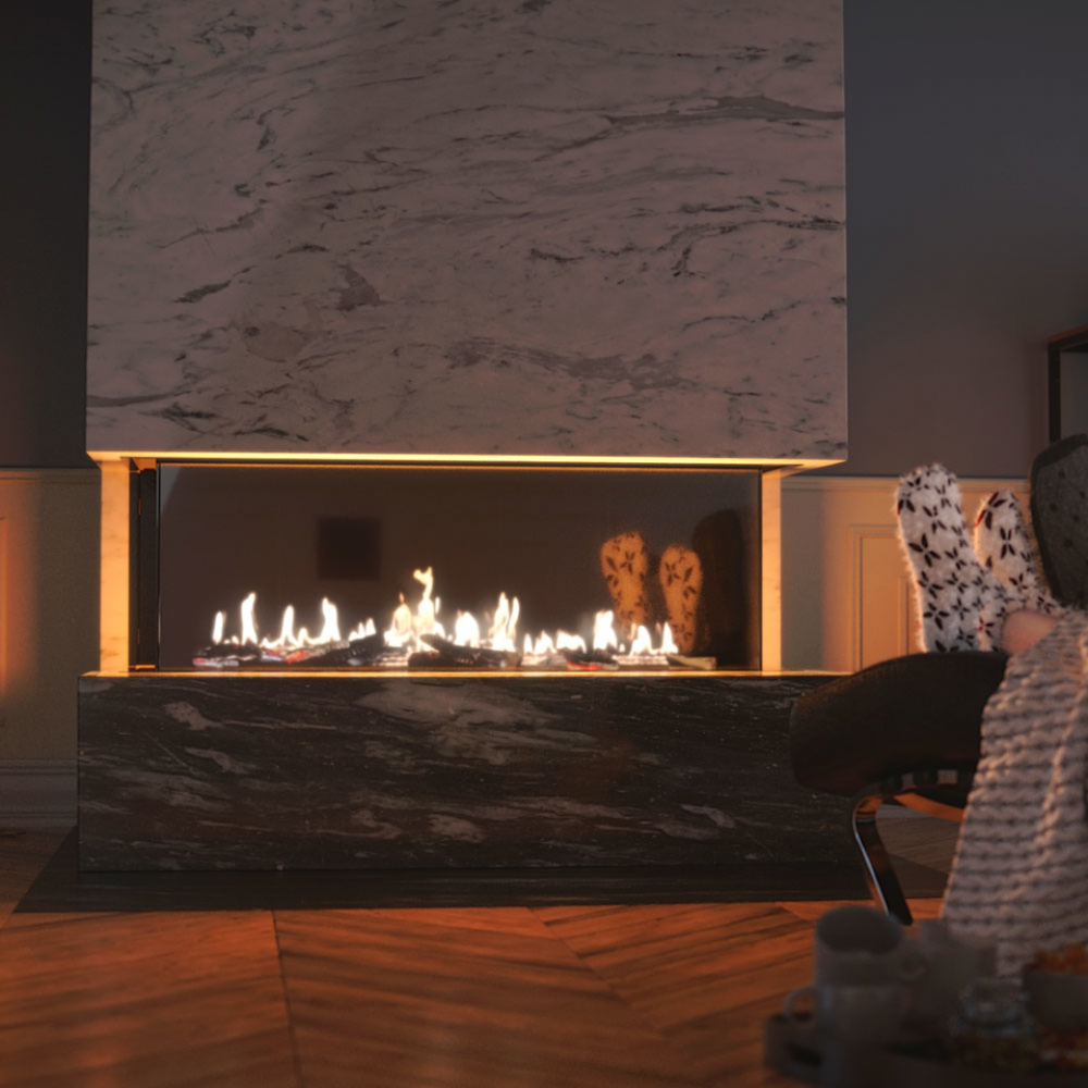 - Беспрепятственное созерцание огня благодаря невидимой рамке фасада и минимальному количеству видимых стальных элементов.