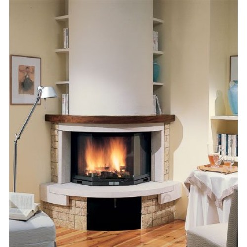 Этот компактный угловой камин в стиле кантри выполнен из колотого королевского мрамора желтого цвета. Нижняя полка и обрамление очага, в свою очередь, изготовлены из мраморной крошки с эффектом бронзы. Балка из дерева и поленница из стали черного цвета дополняют эту модель и делают ее аккуратной и удобной в использовании.