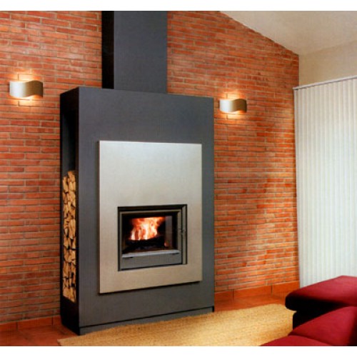 Пристенный металлический камин, вертикальные дровники с двух сторон. Фронтальная рамка из матовой нержавеющей стали. Инсерт Insert Panorama Clima - стандартная версия.
