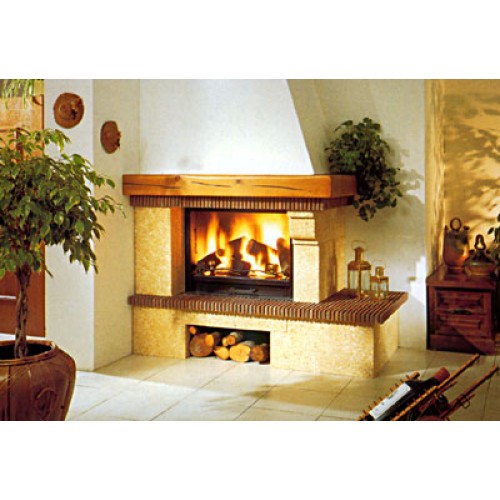 Угловой камин из Гарского камня. Плита и консоль из огнеупорного кирпича, толщиной 1,5 см. Деревянная балка Iroko. Металлическая топка 904 с колосником и зольником.