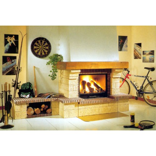 Фронтальный камин из Гарского камня с плитой и консолью из огнеупорного кирпича толщиной 3 см. Деревянная балка из Iroko. Металлическая топка 904 с колосником и зольником.