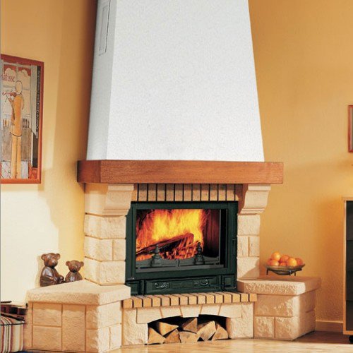 Угловой камин из золотисто-песочного Эдельрока. На снимке представлен камин с топкой F-148 C (Supra).