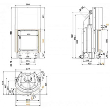Стальная топка со сферическим стеклом. Подъёмная дверца (система Easy-Lift). Горизонтальное открывание двери для чистки стекла. Ширина дверки 616 мм, высота - 486 мм. Возможно подключение воздуха из-вне.