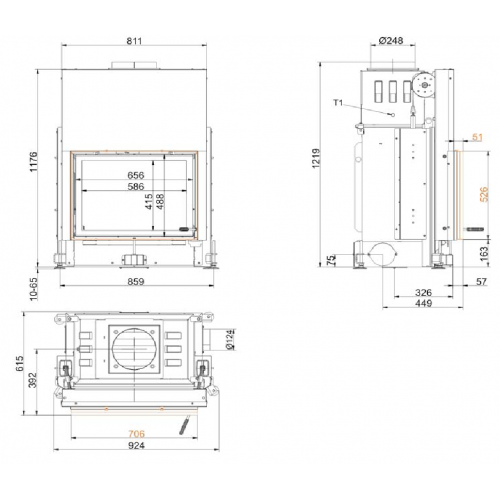Каминная топка с прямым стеклом. Топочная камера футерована шамотом. Подъёмный механизм двери (система Easy-Lift). Ширина дверки 656 мм. Высота дверки 488 мм. Возможно подключение воздуха из-вне. В комплекте поставляется декоративная или монтажная рамка.