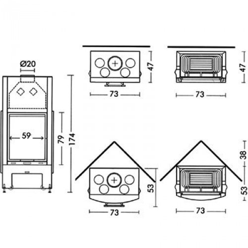 Закрытая топка EdilKamin Stile с натуральной конвекцией с металлической структурой темно серого цвета. Дверца с подъемным механизмом с плоским витрокерамическим стеклом, металл, окрашенный в серый цвет, металлическая цилиндрическая ручка с силиконовой вставкой.