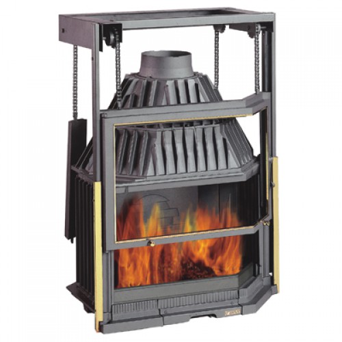 Левосторонняя чугунная топка для камина с увеличенным обзором огня. Регулировка закрытия, увеличенный дымосборник, боковое и вертикальное открывание дверцы и стеклом в форме призмы. Система подъема двери при помощи контргруза.