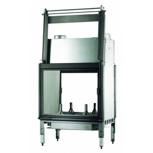 Стальная топка для центральной каминной облицовки. Прямое обзорное стекло с двух противоположных сторон. Дверь с подъемным механизмом. Дымосборник, выдвижной зольник.