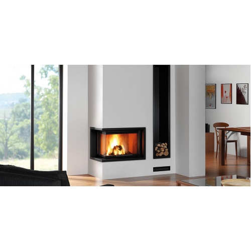 Пристенно-угловая топка с левосторонним открытием двери. Стальной корпус, реверсивная огнепрочная футеровка. За счет бокового стекла увеличивается обзор огня. Удобная загрузка дров, простой уход и экономичный расход топлива. На двери установлено жаропрочное стекло, выдерживающее высокую температуру. Благодаря системе самоочистки стекла, топочное окно остается чистым и прозрачным во время работы прибора.