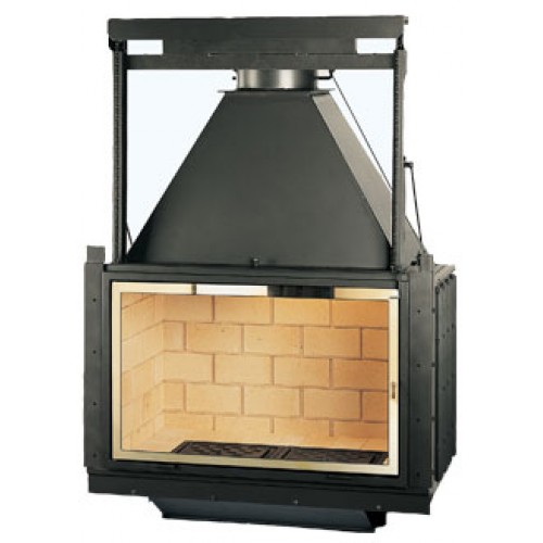 Горизонтальная топка с подъемным механизмом двери. Благодаря большой мощности, такая топка способна отапливать большие помещения и сохранять тепло на протяжении длительного времени. Стенки очага защищены шамотом. Дверь с прямым керамическим стеклом, устойчивым к высоким температурам.