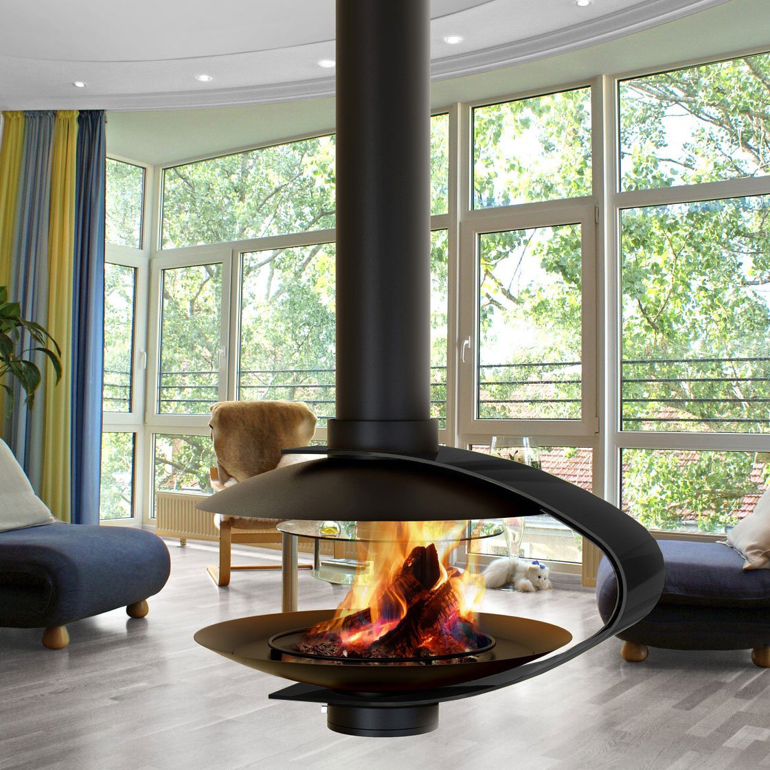 Эксклюзивный центральный подвесной камин, без системы вращения, с декоративным элементом. Цвет - черный.