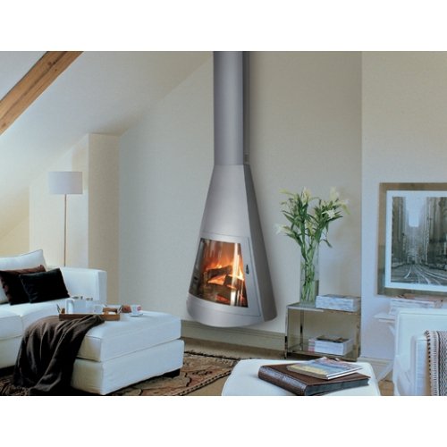 Подвесной пристенный камин, выполненный в стиле High-Tech, изготовлен из жаропрочной стали. Топка с надежной полукруглой дверцей из жаропрочного стекла. Кожух дымохода регулируется по высоте. Встроенная задвижка, при помощи которой можно регулировать тягу.