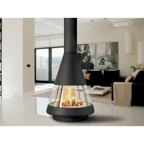 Центральностоящий камин, выполненный в стиле High-Tech, изготовлен из жаропрочной стали. Благодаря оригинальной форме, любоваться огнем можно со всех сторон. Кожух дымохода регулируется по высоте. При помощи встроенной задвижки можно регулировать подачу воздуха. Основание с зольником и декоративными камнями. Камин со стеклом.