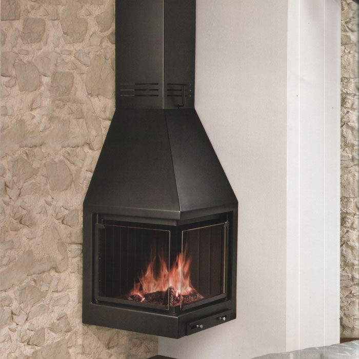 Угловой металлический камин с двойным защитным подвижным стеклом, с цоколем и встроенными дверцами. Топка из толстой стали. Зольник с решеткой встроены в нижнюю часть камина. Снабжен телескопичесим элементом, позволяющим варьировать высоту от 2,60 до 3,10 м (от потолка до пола) и крепежом к потолку, дымоход диаметром 17,5 см.