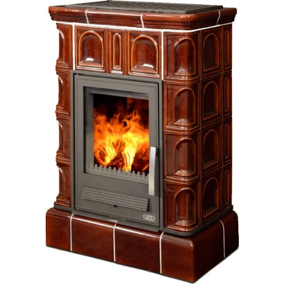 Кафельная печь Britania K - вставка комбо, кафельный цоколь коричневая, с теплообменником