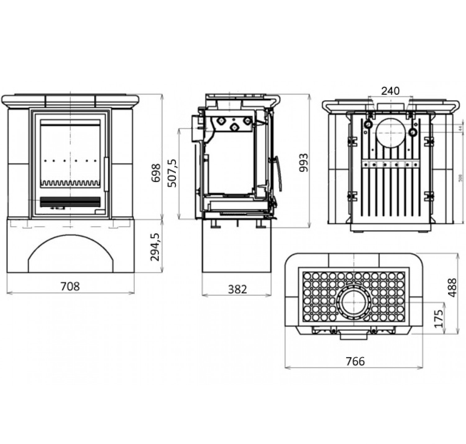 Стекло прямое, выдерживающее нагрев до 800 градусов Цельсия. В качестве финишной облицовки корпуса использовалась керамика глазурованного типа.