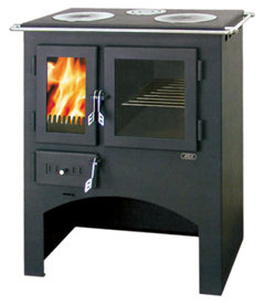 Кухонная плита с духовкой - хороший выбор для пользователя, имеющего дачу или загородный дом, так как позволяет быть независимым от газовых и электрических сетей. Работающая на сухих дровах, печь имеет топку с прямым стеклокерамическим окном, духовой шкаф и варочную поверхность с тремя конфорками. В нижней части печи камина с духовкой расположена небольшая открытая дровница, в которую можно положить каминное топливо. Корпус печи выполнен из листов огнеупорной стали. Несмотря на небольшие габаритные размеры, эта кухонная плита с духовкой имеет мощность в 6 кВт и способна отапливать до 120 куб.метров жилой зоны.