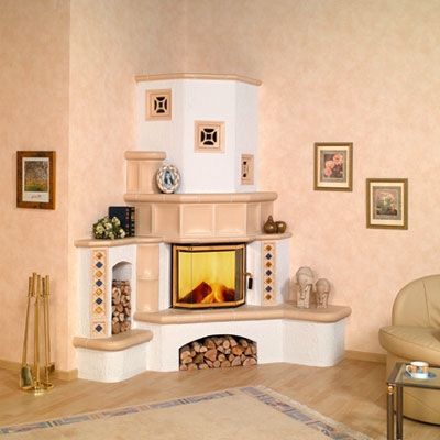 Угловой камин из изразцов цвета sahara. Банкетка.