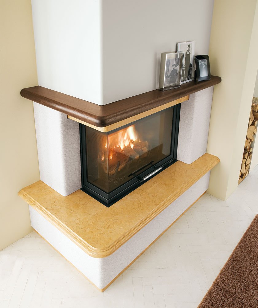Облицовка из белого бучардированного камня со столешницей и плинтусом из полированного Giallo Egizio. Деревянная балка - шпонированный орех.