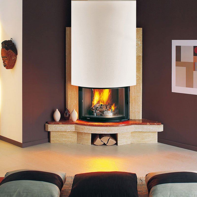 Угловой камин. Изготовлен из камня Castillon + красный "rocmarble" Corallin.