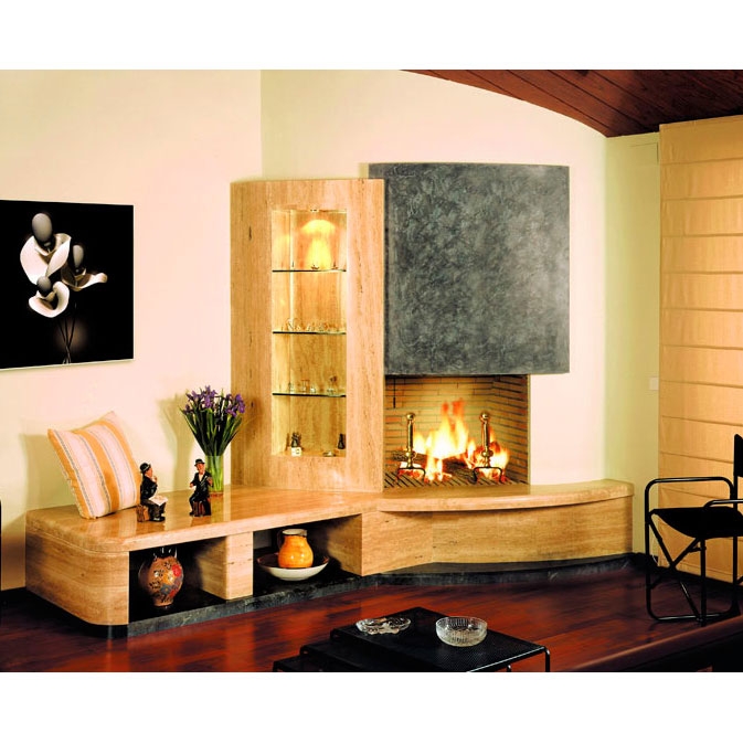 Угловой камин полукруглой формы из полированного Travertino, пропитанного прозрачными смолами. Цоколь из полированного мрамора Negro Marquina. Топка 918 из кирпича.