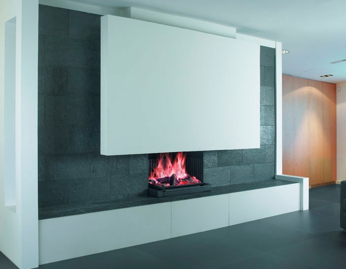 Пристенный камин с основанием из белого матового мрамора Blanco Yugoslavo. Плита и фасад из черного сланца Писарра (60х30 см). Металлическая топка Class 90 2L.