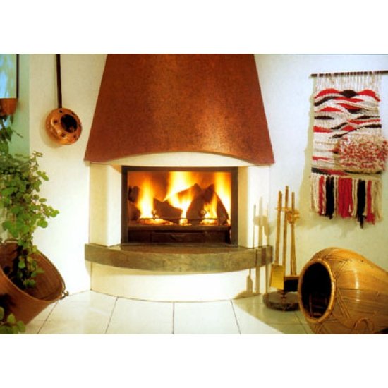 Угловой камин из полированного Crema Moka. Плита из полированного камня San Vicente. Металлическая угловая топка 909 с зольником и колосником.