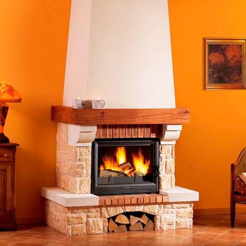 Пристенная облицовка из разноцветного бутового камня, белого камня Provence. Балка из дерева экзотической породы Iroko. Элементы из разноцветного бута выполнены в старинном французском стиле. Широкая гамма совместимых топок.