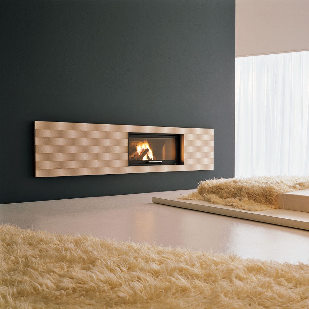 Облицовка из матового Bianco Mediterraneo с эффектом волн. Внутренние рамки - окрашенная серая сталь.