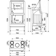 Также в этой печи предусмотрены система двойного дожига, система чистое стекло и функция медленного горения. Под топкой внизу расположена ниша для хранения дров, а над топкой — ниша для разогрева пищи.