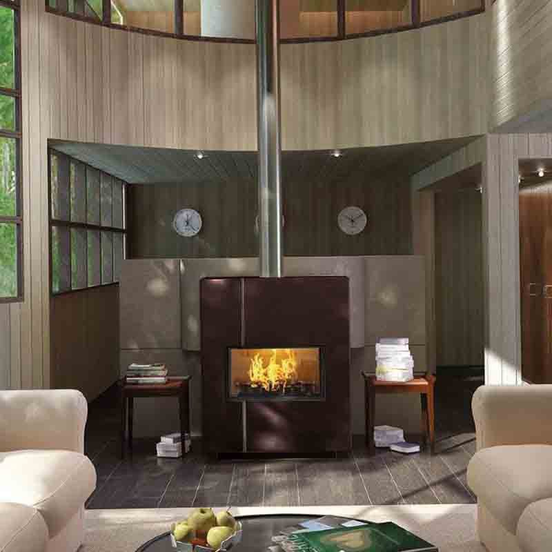 Металлическая отопительная печь-камин. Ввод наружнего/первичного воздуха. Облицовка для топки из нержавеющей стали. Вертикальная полоска-инкрустация из нержавеющей стали. Поднимающаяся и открывающаяся классическим способом дверца. Цвет RAL 8017.