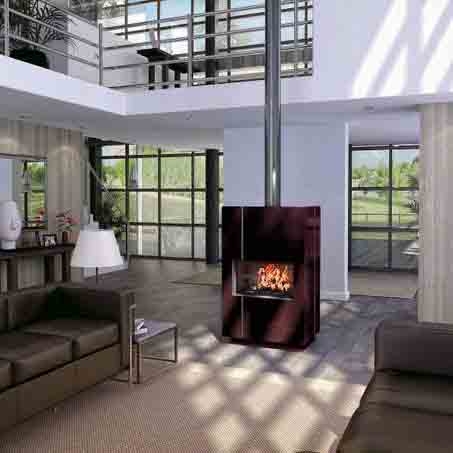 Металлическая отопительная печь-камин. Ввод наружнего/первичного воздуха. Облицовка для топки из нержавеющей стали. Вертикальная полоска-инкрустация из нержавеющей стали. Поднимающаяся и открывающаяся классическим способом дверца. Цвет RAL 8017.