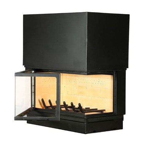 Угловая правая каминная топка со стеклом 16/9. Стекло топки - цельное.