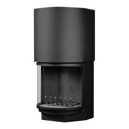 Панорамная топка черного цвета, кирпичи - черного цвета. Закругленное стекло.