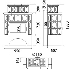 Дровяная топка-кассета со стальной передней панелью, украшенной чёрными вставками, и внутренней частью, выполненной из чугуна, укомплектованная механизмом автоматической регулировки задвижки для продуктов горения. Два выхода для воздуховодов горячего воздуха, которые могут служить альтернативой фронтальному.