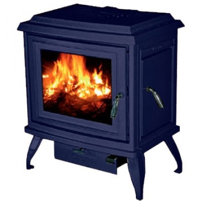 Печь с фронтальной и боковой дверцами, имеет систему Чистое стекло, ручка дверцы не нагревается в процессе топки. Печь покрыта эмалью, цвет - синий.