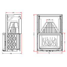 Каминная топка с прямым стеклом. Топочная камера футерована шамотом. Подъёмный механизм двери (система Easy-Lift). Ширина дверки 1010 мм. Высота дверки 458 мм. Возможно подключение воздуха извне.