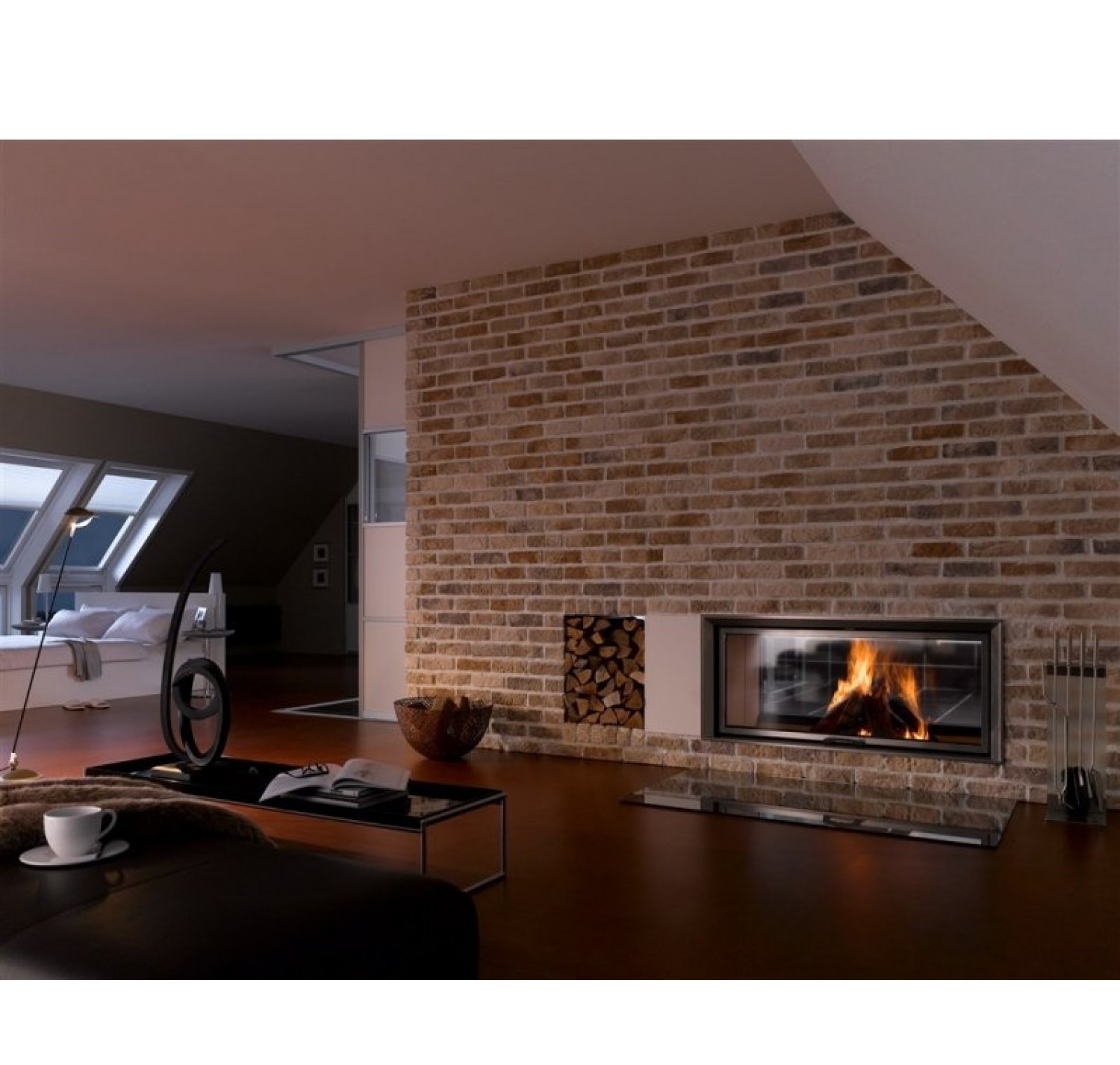 Двухсторонняя каминная топка с прямым стеклом. Топочная камера футерована шамотом. Подъёмный механизм двери (система Easy-Lift) с одной стороны. С другой стороны дверца откидывается для чистки.