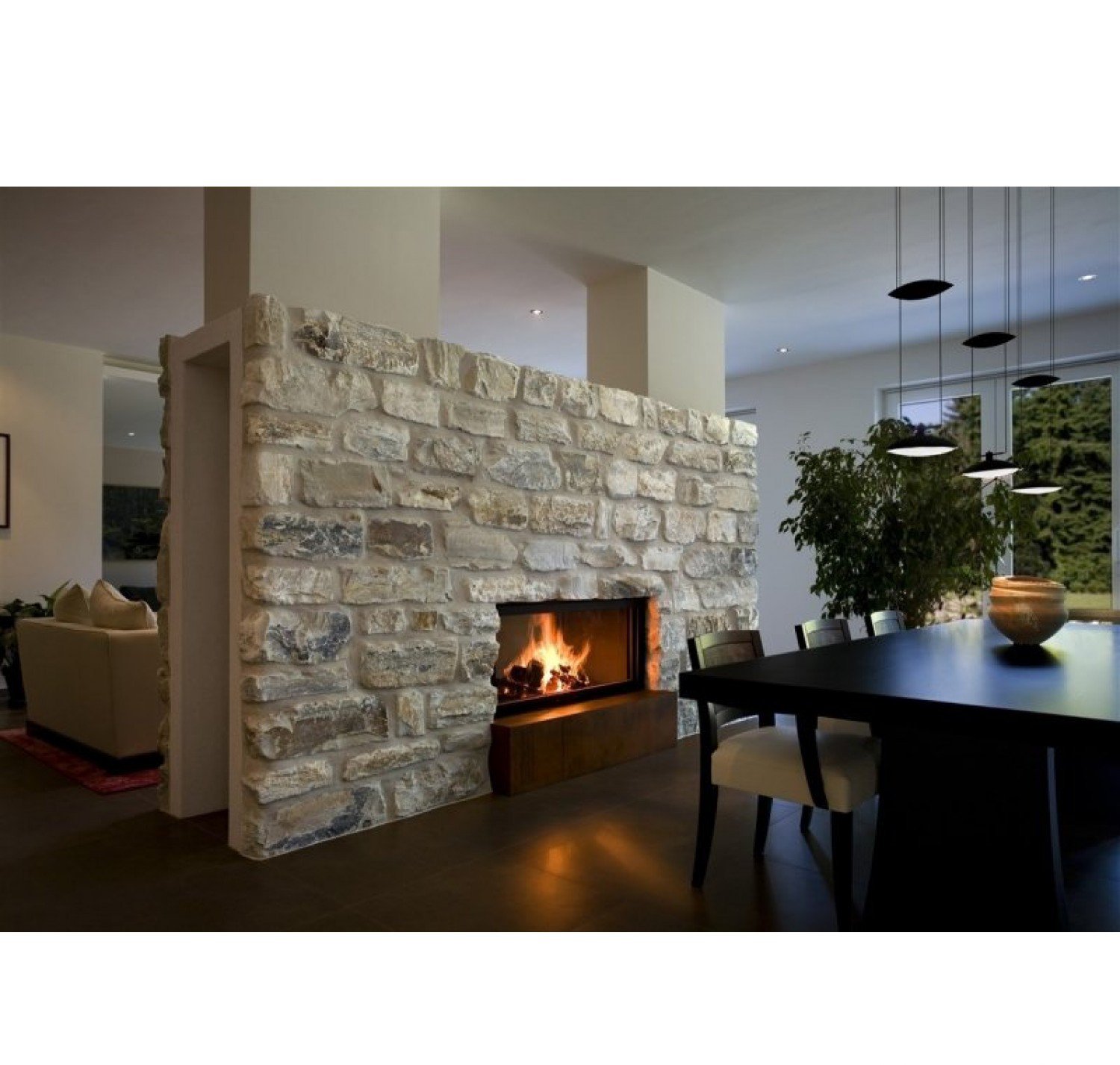 Двухсторонняя каминная топка с прямым стеклом. Топочная камера футерована шамотом. Подъёмный механизм двери (система Easy-Lift) с одной стороны. С другой стороны дверца откидывается для чистки. Ширина дверки 981 мм. Высота дверки 422 мм. Возможно подключение воздуха извне.