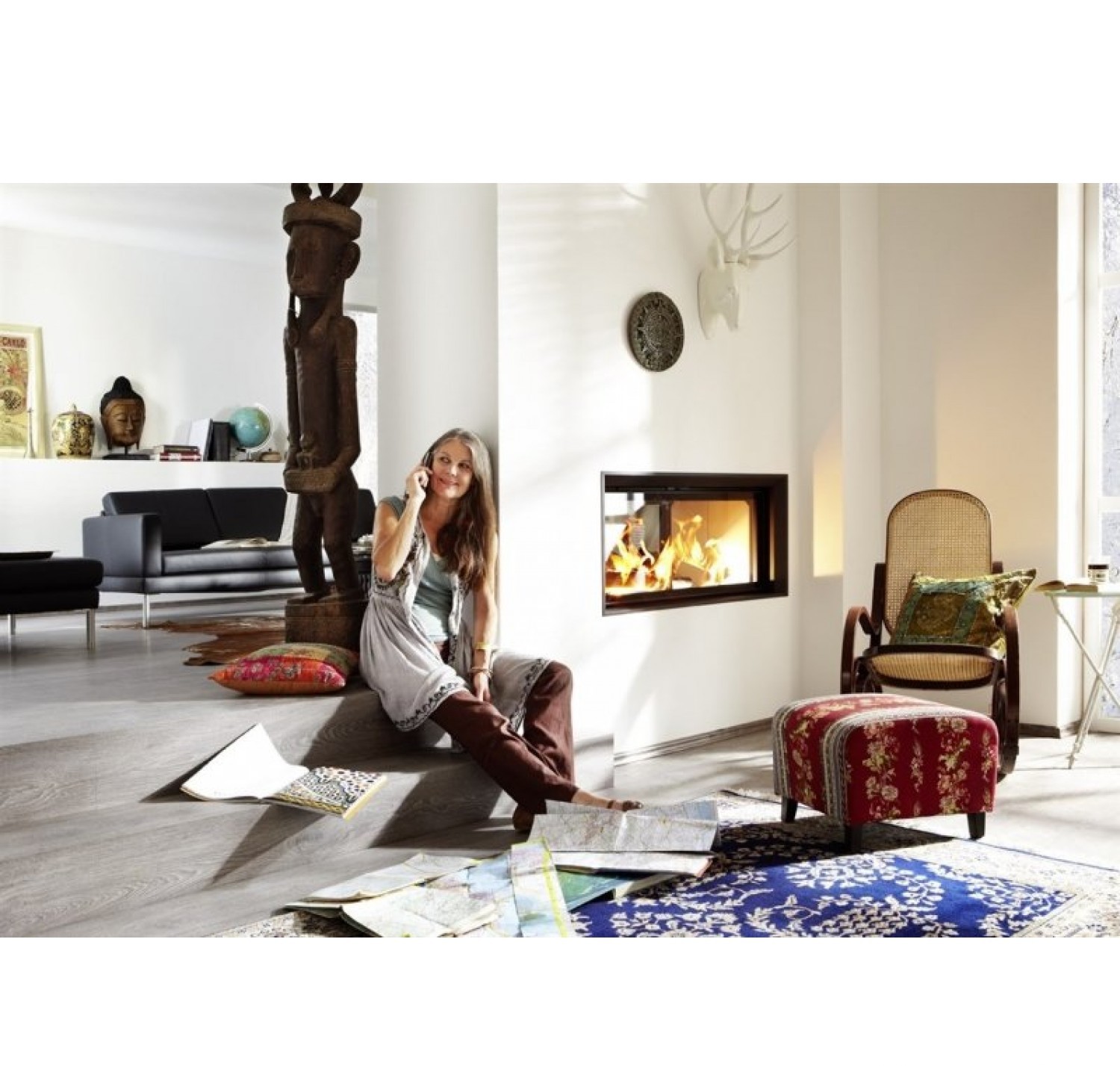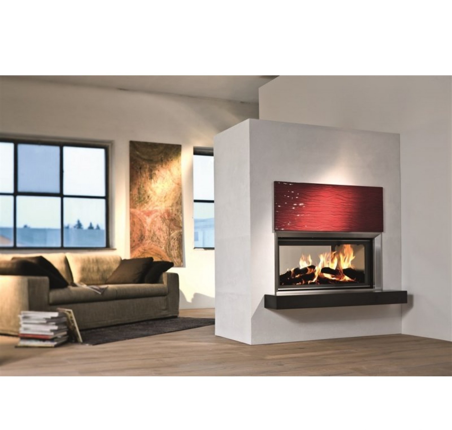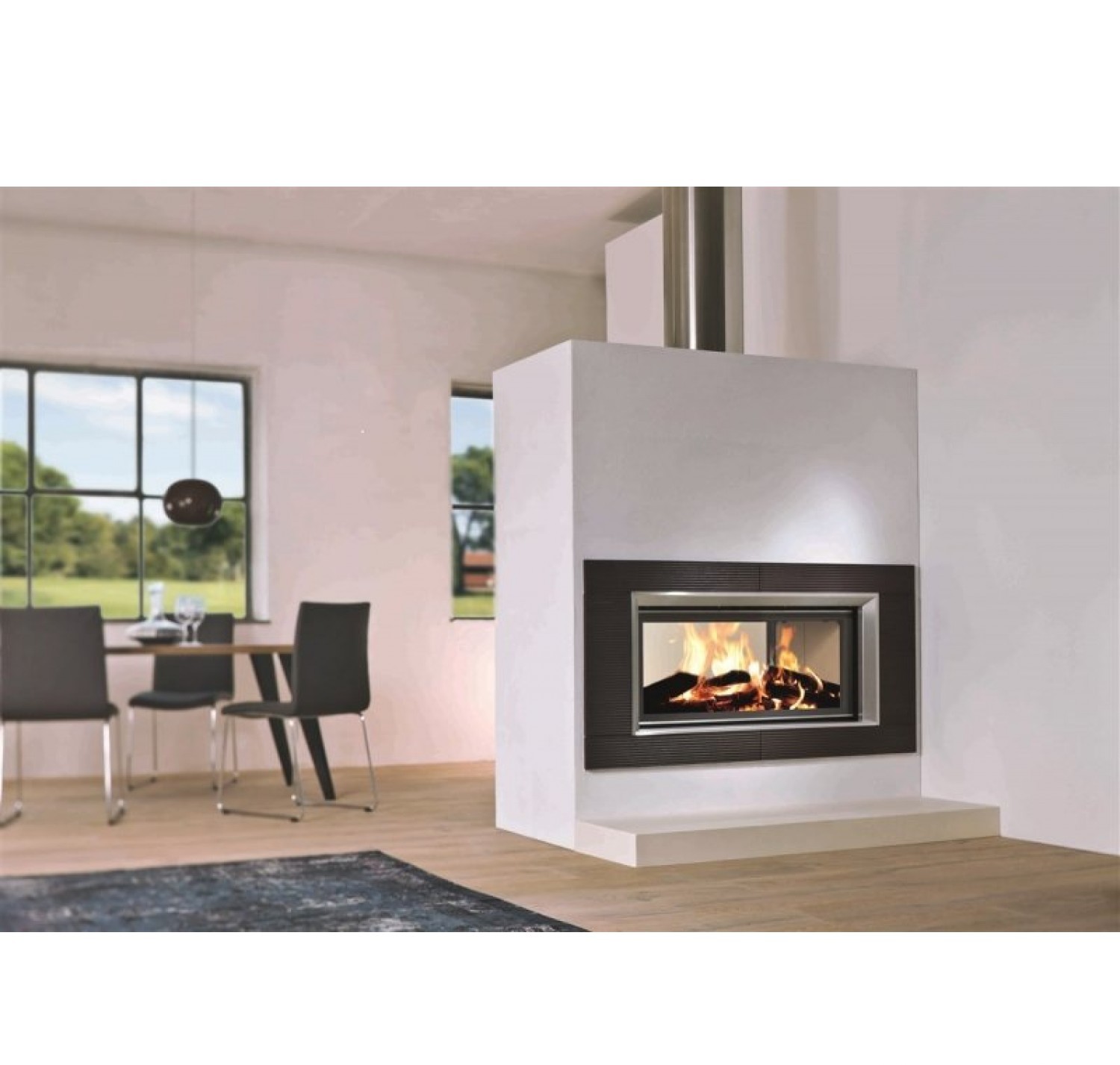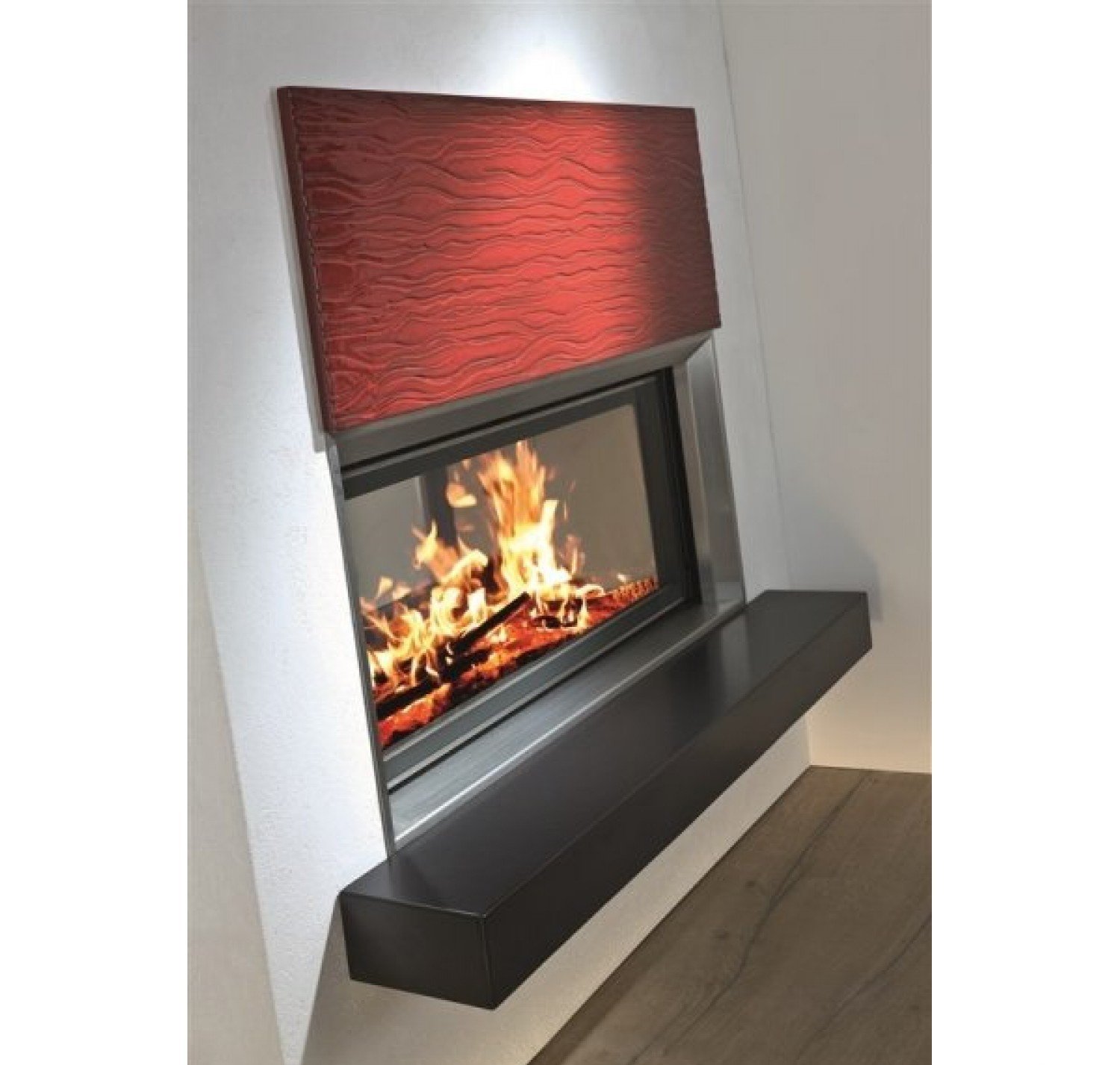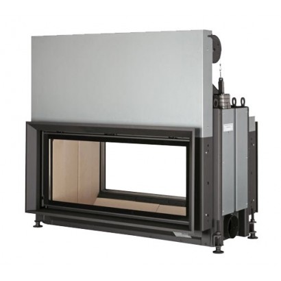Двухсторонняя каминная топка с прямым стеклом. Топочная камера футерована шамотом. Подъёмный механизм двери (система Easy-Lift) с одной стороны. С другой стороны дверца откидывается для чистки. Ширина дверки 981 мм. Высота дверки 422 мм. Возможно подключение воздуха извне.
