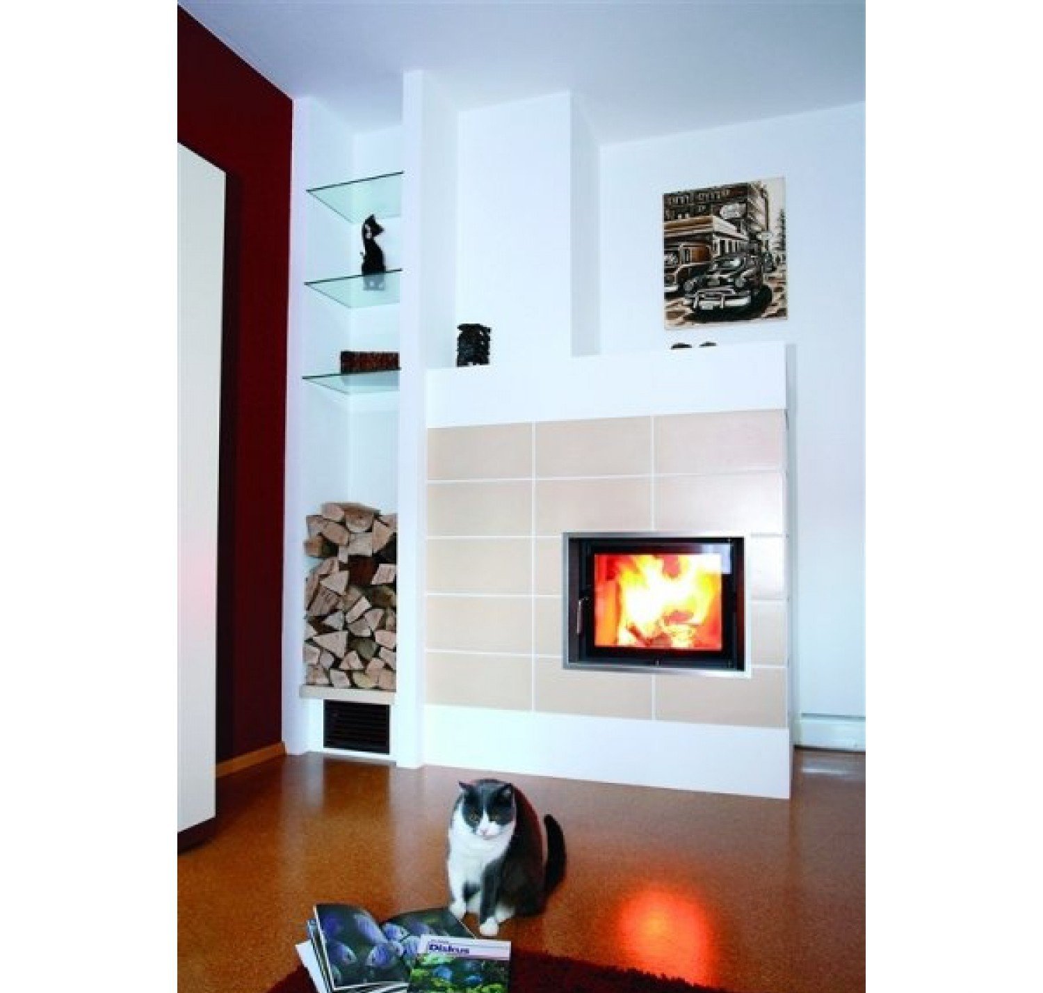 Стальная каминная топка с прямым стеклом. Боковое открывание двери. Ширина дверки 656 мм. Высота дверки 488 мм. Возможно подключение воздуха извне.