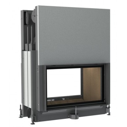 Двухсторонняя каминная топка с прямым стеклом. Топочная камера футерована шамотом. Подъёмный механизм двери (система Easy-Lift) с одной стороны. С другой стороны дверца откидывается для чистки. Ширина дверки 880 мм. Высота дверки 538 мм. Возможно подключение воздуха извне.